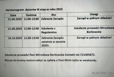 Czytaj więcejSzkolenia prowadzi Pani Mirosława Borkowska, kontakt tel. 721465872. Klucze do bramy można nabyć za opłatą u Pani Mirki tylko w weekendy. Data Godzina Kto Uwagi 21.09.2025 11:00–13:00 Zebranie Zarządu Zarząd…